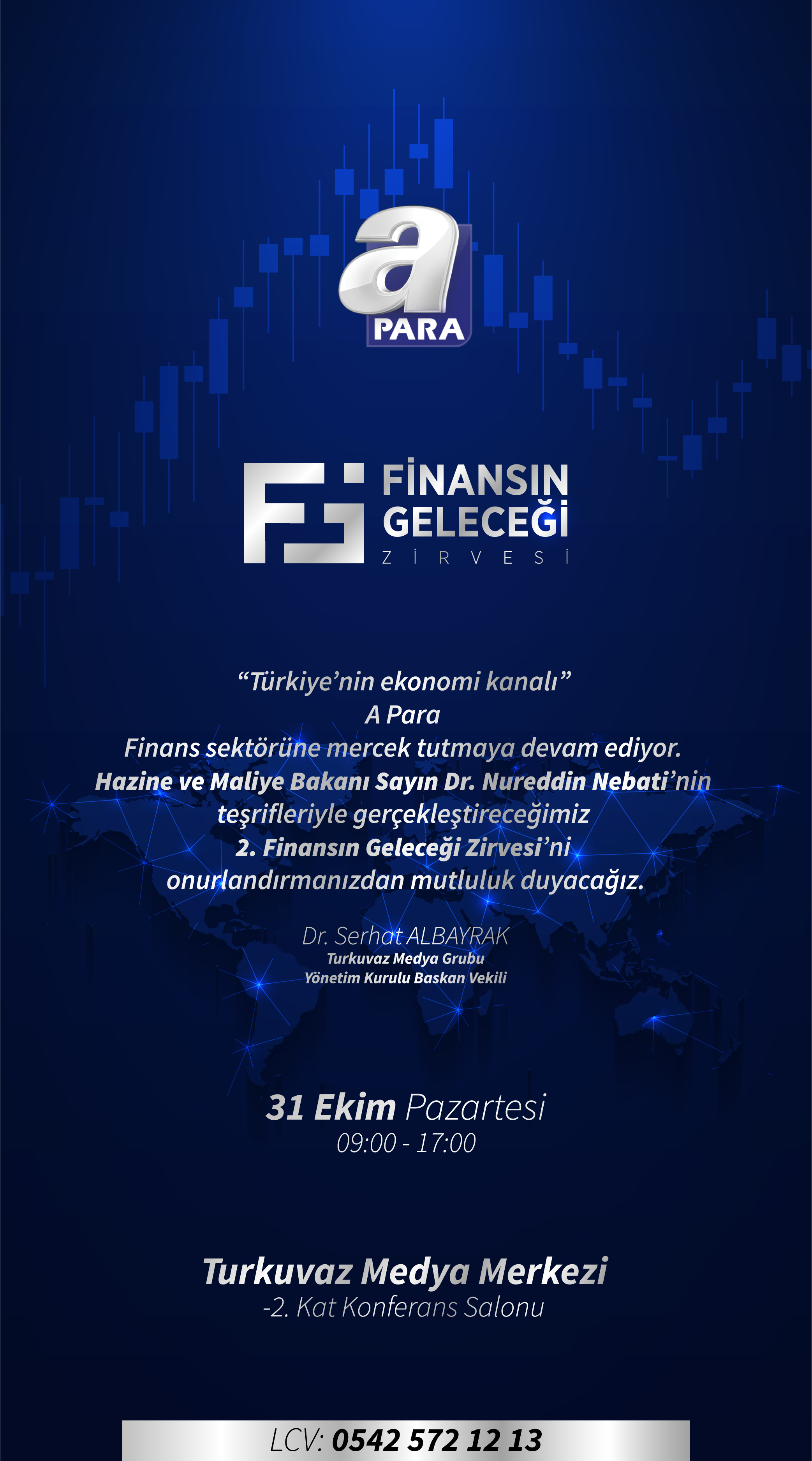 Turkuvaz Grup A Para tarafından düzenlenen, Hazine ve Maliye Bakanımız Sayın Nureddin Nebati’nin teşrifleri ile gerçekleşecek ve öğle yemeği sponsoru olduğumuz Finansın Geleceği Zirvesi 31 Ekim 2022 tarihinde gerçekleşecektir. Katılım sınırı bulunmamakta olup, katılım bildirimlerinizi davetiyede yer alan 0542 572 12 13 numaralı telefona bildirmenizi rica ederiz.