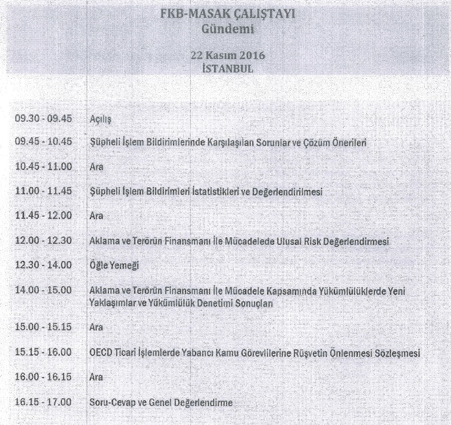 Finansal Kurumlar Birliği, Türkiye Sigorta, Reasürans ve Emeklilik Şirketleri Birliği ve Türkiye Sermaye Piyasaları Birliği'nin ortaklaşa düzenlemekte olduğu uyum görevlilerinin veya bağlı bulundukları üst düzey yöneticilerinin katılımının öngörüldüğü MASAK çalıştayı 21-22-23 Kasım 2016 tarihlerinde gerçekleştirilecektir.